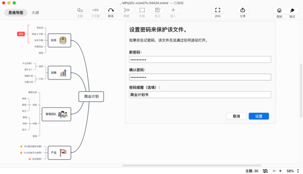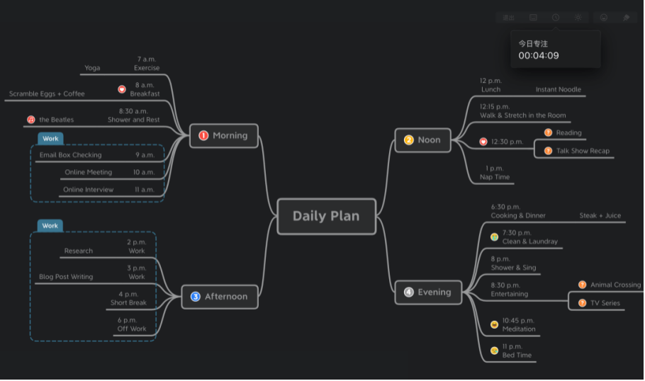 能让你更加专注思考的全屏沉浸模式,整个界面以导图为主体,右上角排布着一行淡色功能按钮,以及专注时间提醒。