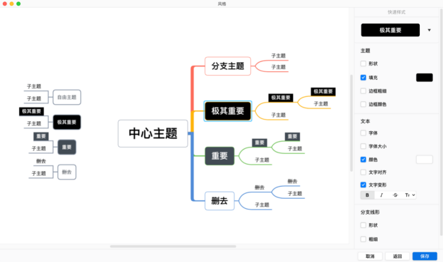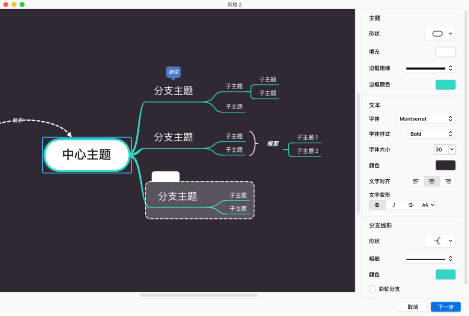 你可以自由发挥创意,随心修改风格模板中的字体、样式、线形等参数,构建属于自己的思维导图模板,使用时一键应用即可。