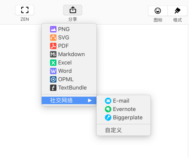 XMind 2020 默认提供三种常用分享方式:邮件、印象笔记、Biggerplate,让思路不用局限于软件之中。