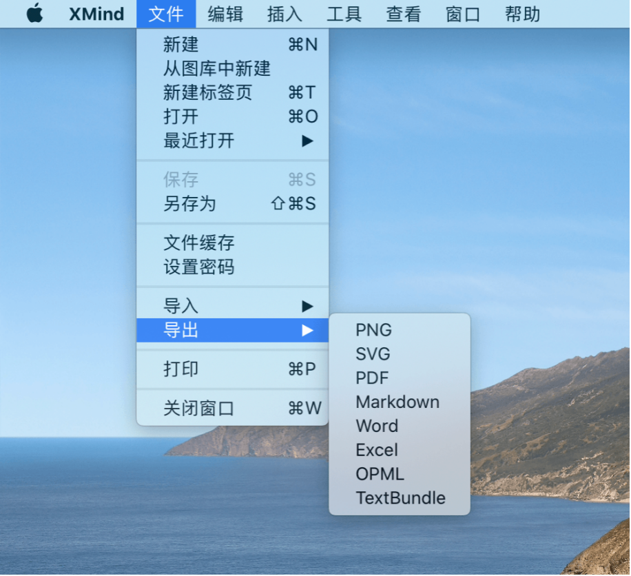 格式多样的导出功能,能满足各种用户的不同需求,目前思维导图支持导出成 PNG、PDF 格式,同时还能一键导出所有画布。