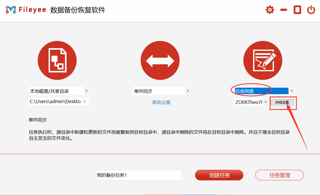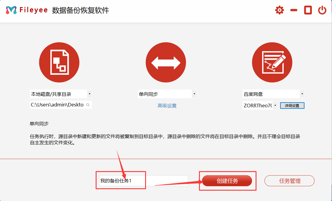 步骤1,打开安装好的FlieYee数据备份恢复,左边选择“本地磁盘”然后选择备份文件源文件夹,然后在中间位置设置同步方式,我们选择单向同步。
