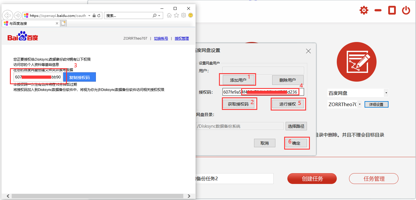 步骤2,右边备份目标选择“百度网盘”,然后点击详细设置按钮添加百度网盘用户;如下图二所示,点击“添加用户”-“获取授权码”-复制授权码-粘贴授权码-“进行授权”,授权成功后点击“确定”按钮保存。