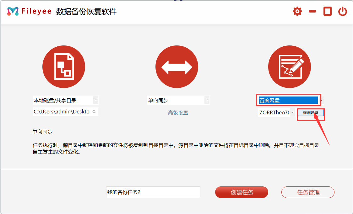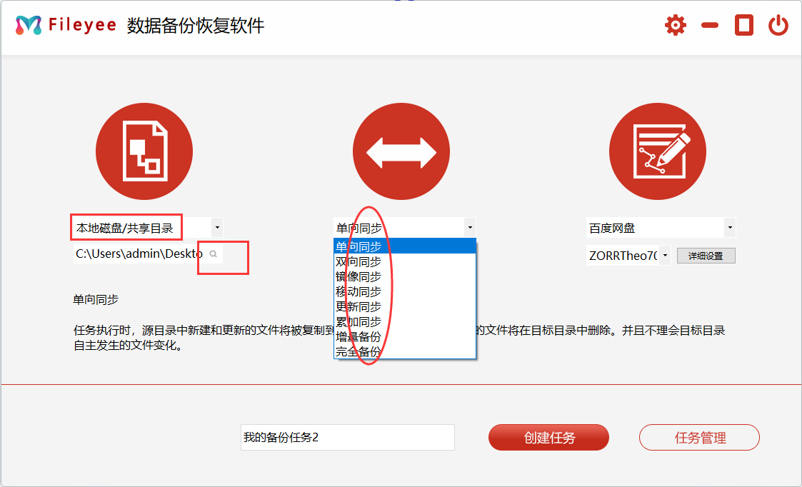 步骤1,打开安装好的FileYee数据备份恢复软件,软件左边备份源选择“本地磁盘”,然后选择电脑中需要备份的电脑文件夹;中间是备份同步方式,根据你的需要选择适合你的同步方式。
