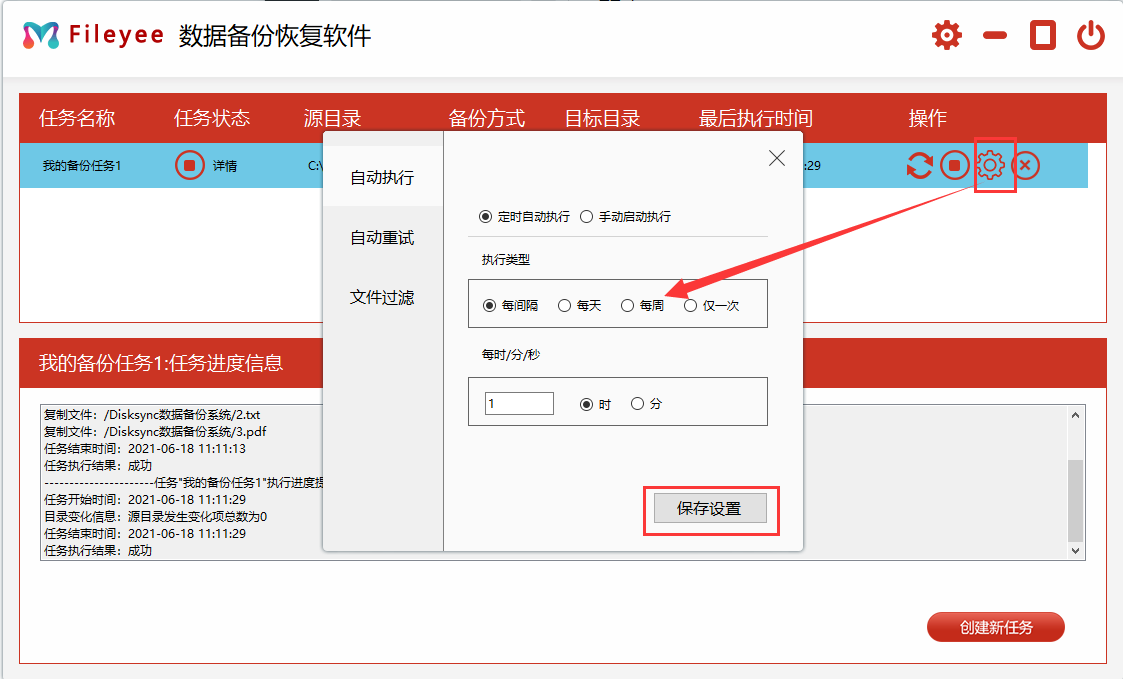 步骤5,如下图所示点击“设置”按钮,弹出自动备份相关参数设置的窗口,可以根据自己的需求设置自动备份的相关参数,然后保存。这样软件就会定时自动备份电脑文件到百度网盘了。如果不设置参数,软件会默认一个小时帮你自动备份一次