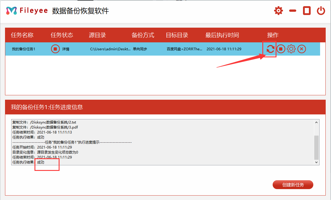 步骤4,新建任务成功后会自动跳转至备份任务管理页面,点击备份任务右边的“开始”图标按钮,这样就开始执行备份了,当结果显示成功时说明电脑文件成功备份到了百度网盘。