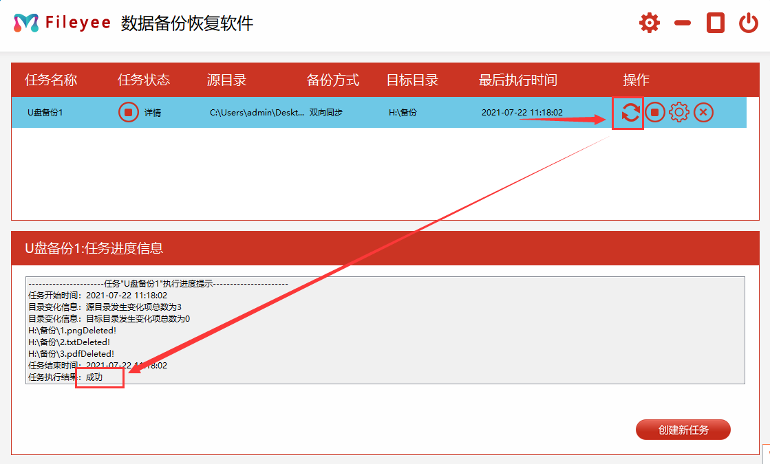 步骤4,在任务管理页面找到创建的任务,点击“开始”图标,启动备份任务,执行结果显示成功说明备份成功了。软件是默认一个小时自动备份一次。
