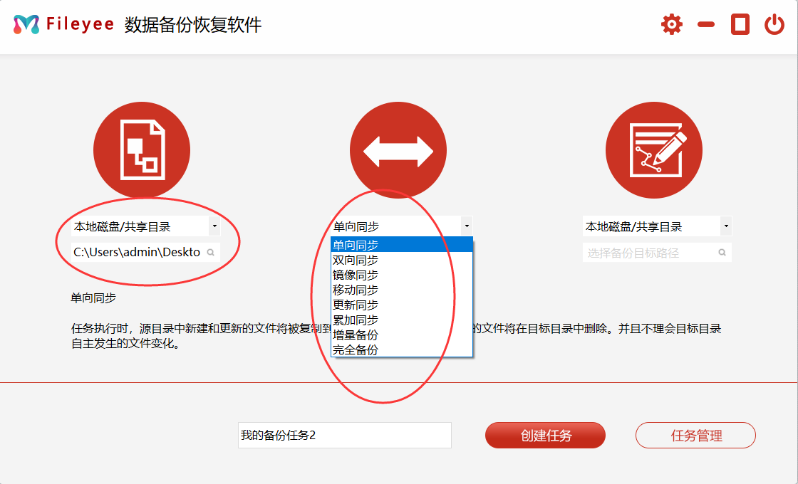 步骤1,下载FlieYee数据备份恢复软件安装后打开,然后进行设置。如下图所示左边设置备份源,我们选择“本地磁盘/共享目录”,然后添加备份文件夹路径;中间设置文件同步方式,根据自己的情况选择即可。