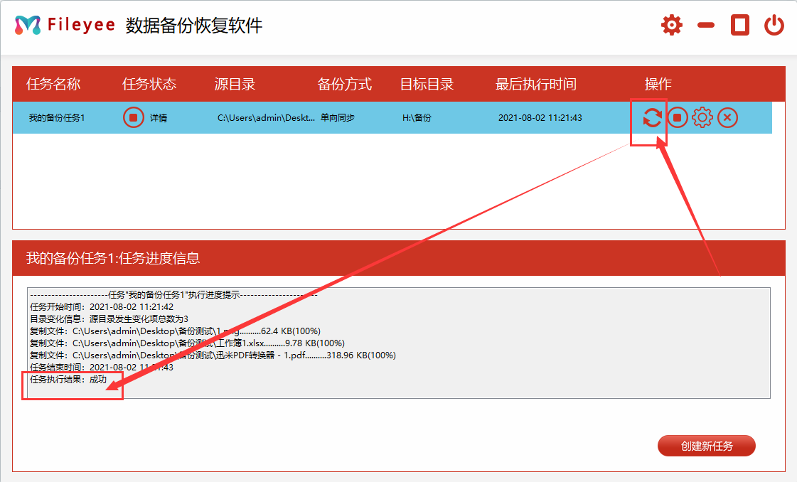步骤4,点击备份任务右边对应的“开始”图标按钮,这样就启动这个备份任务了,当执行结果为成功,说明文件成功备份到了移动硬盘。