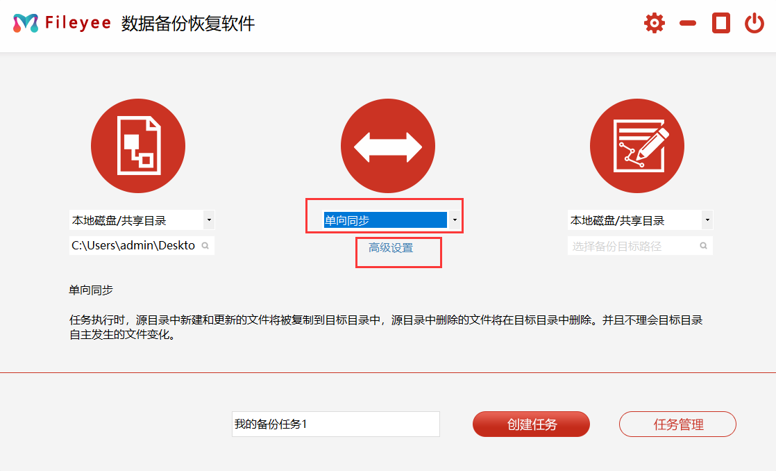 第二步,中间设置文件备份的数据同步方式,方式有很多种,选择适合自己的即可,然后点击“高级设置”,设置定时自动备份的相关参数,如果不设置软件会一个小时自动备份一次。