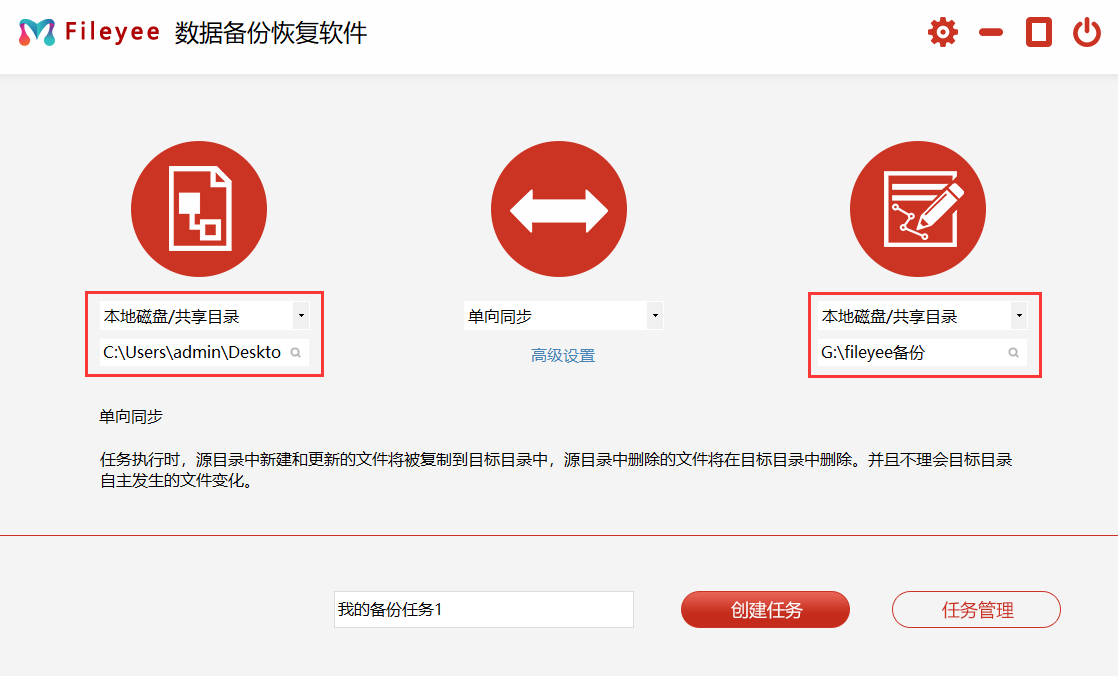 步骤2,选择文件同步的方式,有很多种,根据自己的备份需求选择一个。然后点击高级设置按钮,设置自动备份的相关参数,如果不设置软件会自动一个小时备份一次。最后输入备份任务名,点击“创建任务”按钮,创建备份任务。