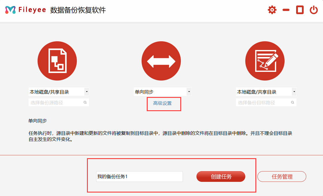 首先,下载Fileyee数据备份恢复软件后安装打开,然后进行设置,如下图所示,分别对应“需要备份数据的目录”、“备份数据传输方式”、“份数据的保存目录”进行设置。Fileyee目前有8种备份方式,包括:单向同步、双向同步、镜像同步、移动同步、更新同步、累加同步等。