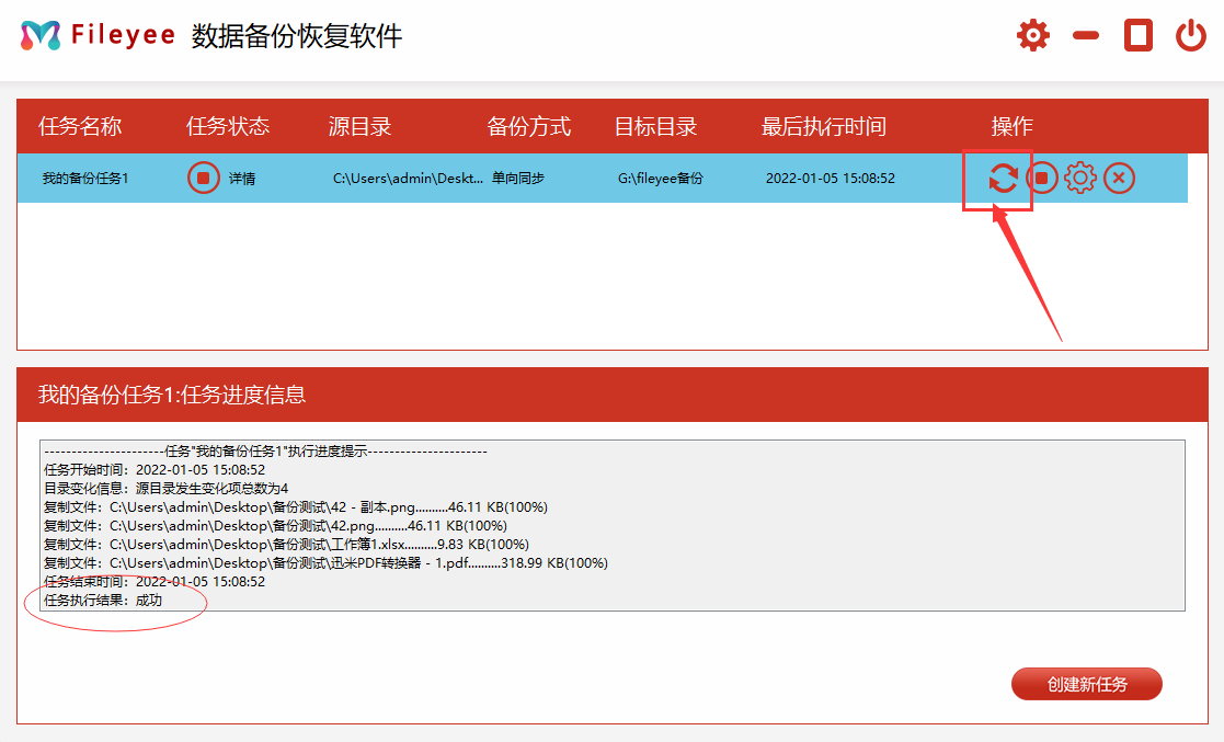 步骤3,点击任务管理页面中备份任务右边的开始图标,启动软件程序。执行结果为“成功”的时候,说明备份完成,之后只要不关闭软件,就可以实现文件的自动备份了。