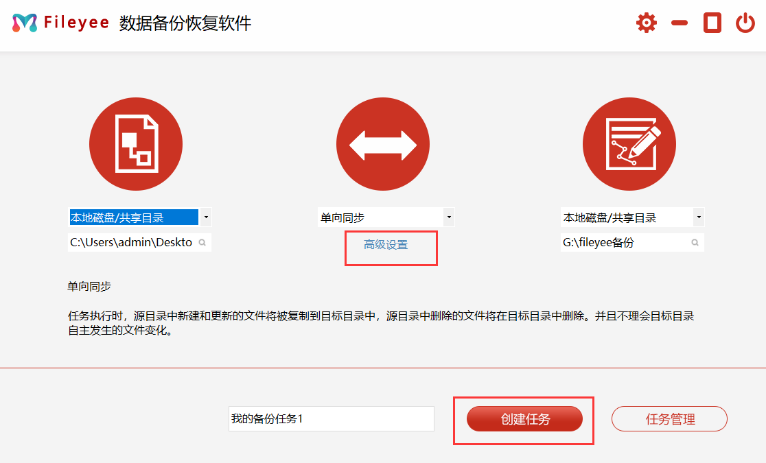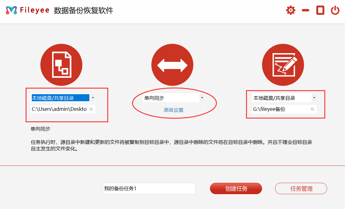 步骤1,打开电脑上安装好的FileYee数据备份恢复软件,如下图所示进行设置,左边选择需要备份的文件夹,中间选择文件的同步方式,右边选择备份的目标位置。软件支持备份到磁盘、U盘、移动硬盘、百度网盘、服务器ftp等。
