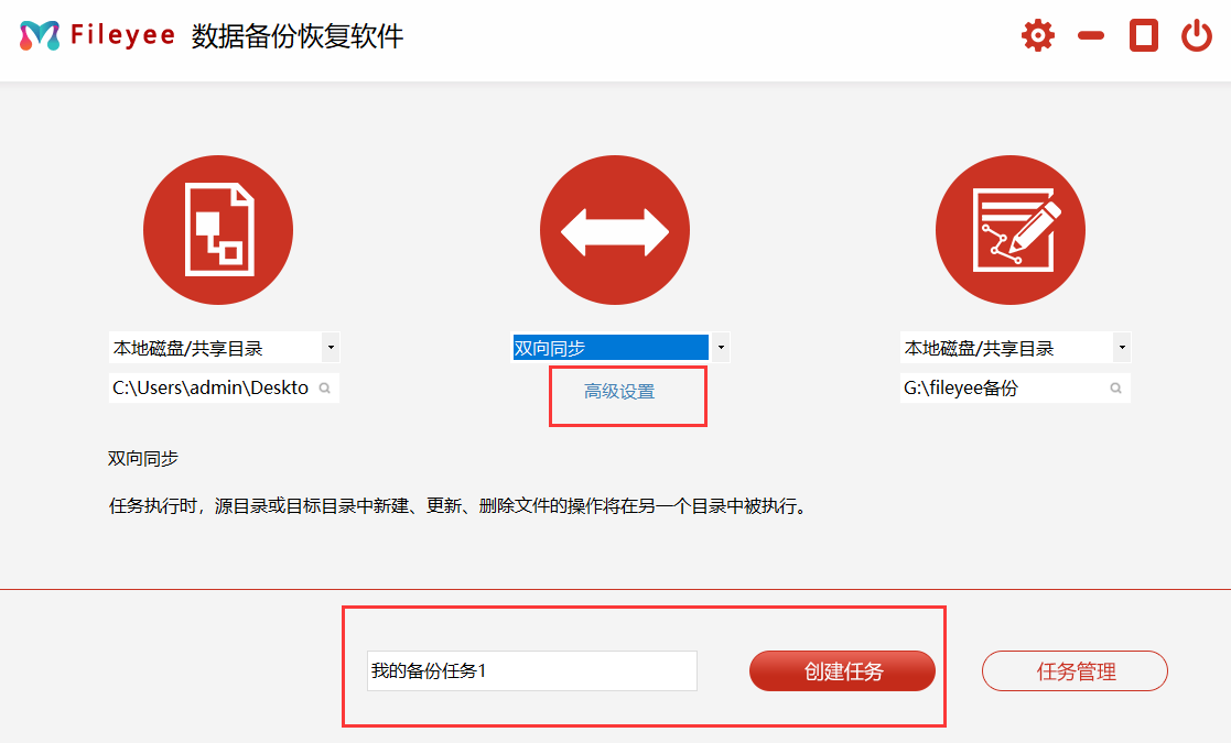 步骤1,打开已经安装好的Fileyee数据备份恢复软件,进行设置,左边选择备份源(需要备份的文件夹);中间同步方式选择双向同步;右边选择备份目标(文件备份到哪里)。