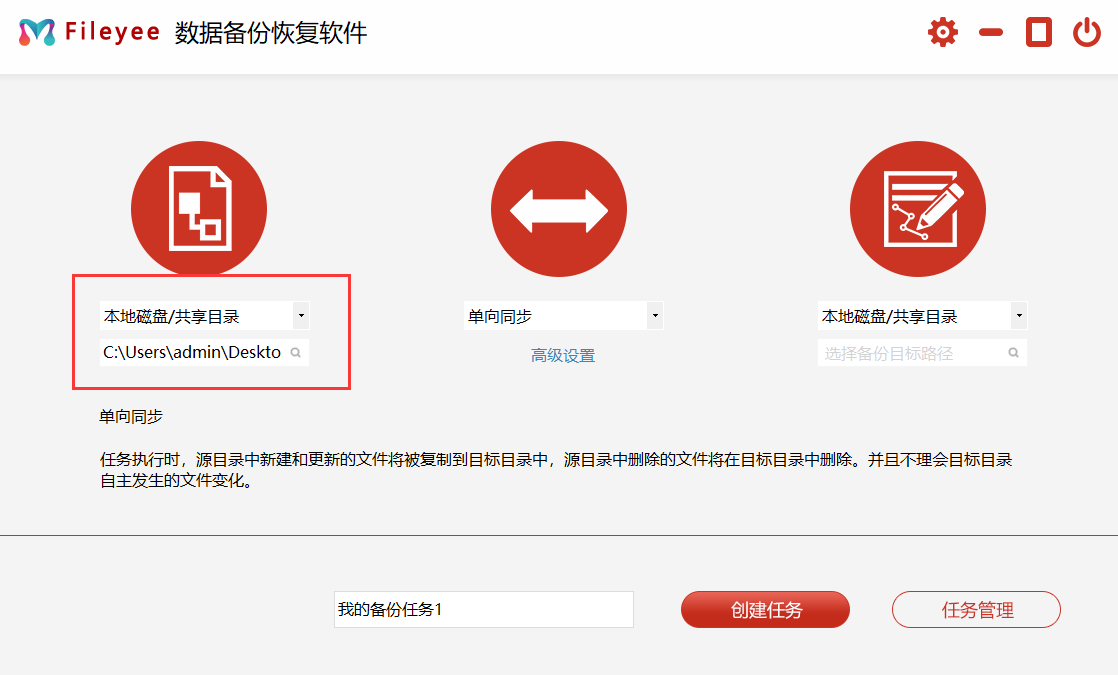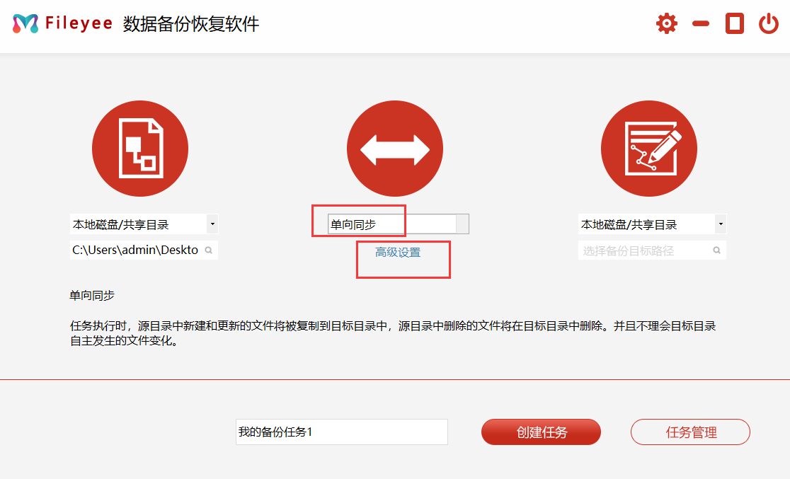 步骤2:然后,选择文件传输的方式。目前,Fileyee有多种方式,包括:单向同步、双向同步、增量同步、镜像同步、移动同步等等。简单一点的备份,可以直接勾选“单向备份”。此外,想要实现定时的数据备份,还需要点击下方“高级设置”设置自动备份的相关参数。
