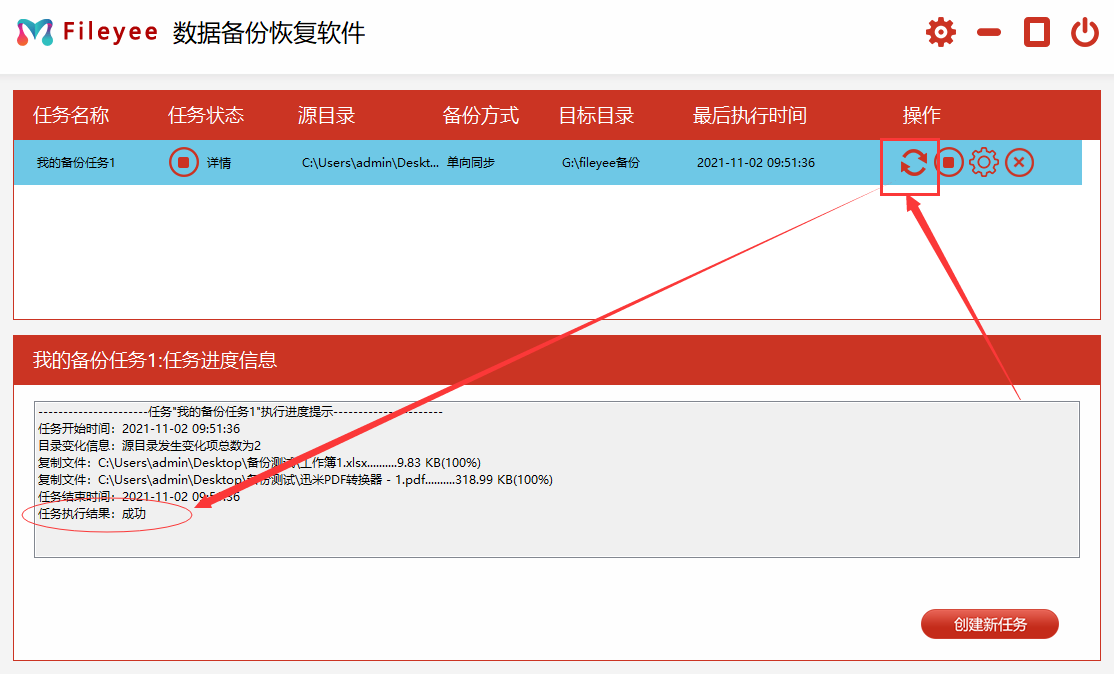 步骤4,点击备份任务右边对应的“开始”图标按钮,启动备份任务,当执行结果为“成功”的时候,说明文件备份成功了。之后软件就会按照设置的参数进行自动备份了,无需手动开启备份任务。