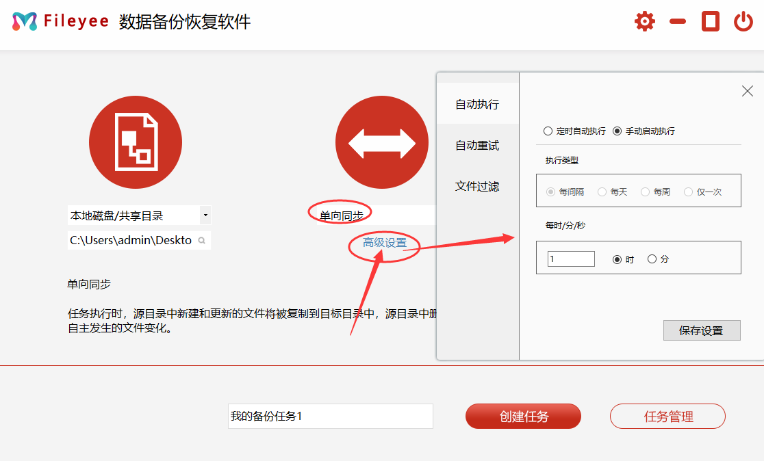 步骤2,然后设置文件备份的同步方式,方式有很多在,也有相关的具体介绍,根据自己的需求选择适合自己的。然后点击“高级设置”,设置实时自动备份的相关参数。