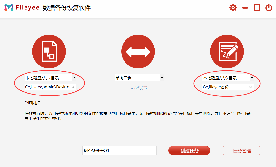 步骤1,下载好“FileYee数据备份恢复”软件后双击安装打开使用,然后进行设置,如下图所示左右两边分别设置备份源和备份目标的位置,也就是你电脑中哪个文件夹的文件需要备份到哪里。