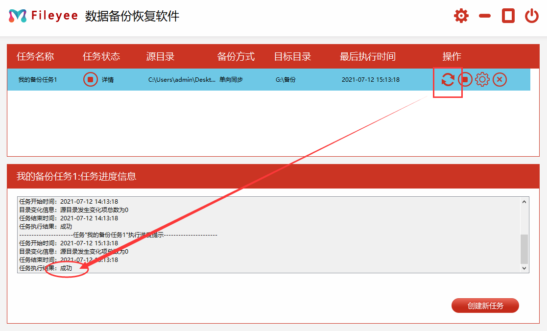 第4步,点击对应任务右边的“开始”图标,开启转换程序,当下方执行结果显示成功的时候,说明文件备份成功了。