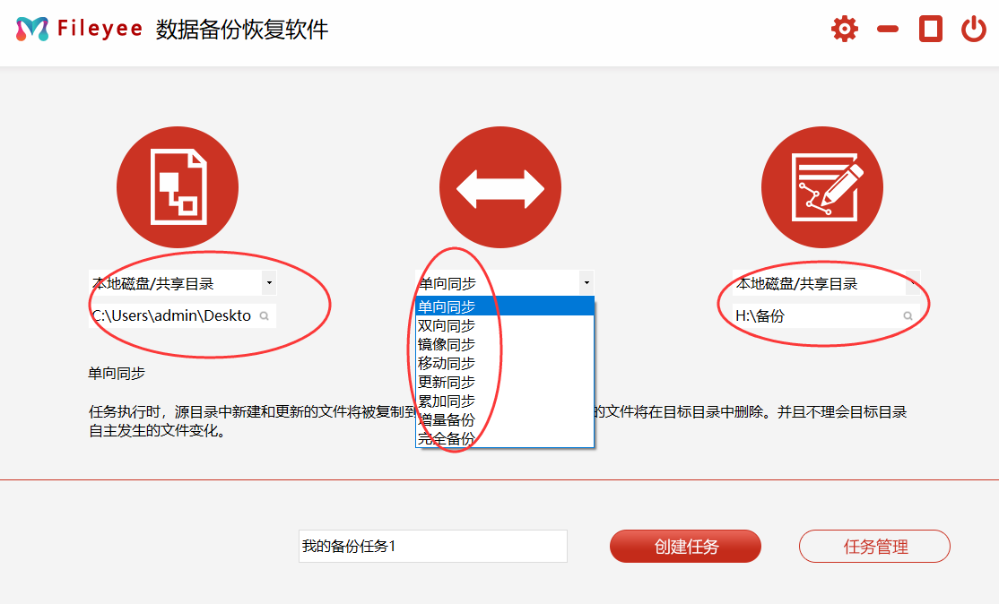 第2,如下图所示进行设置,左边选择电脑中需要进行文件备份的文件夹(提前将电脑文件放到文件夹内);中间选择合适的文件同步方式,这里我选择“单向同步”;右边设置文件备份到的位置,我们选择刚刚插入的U盘。