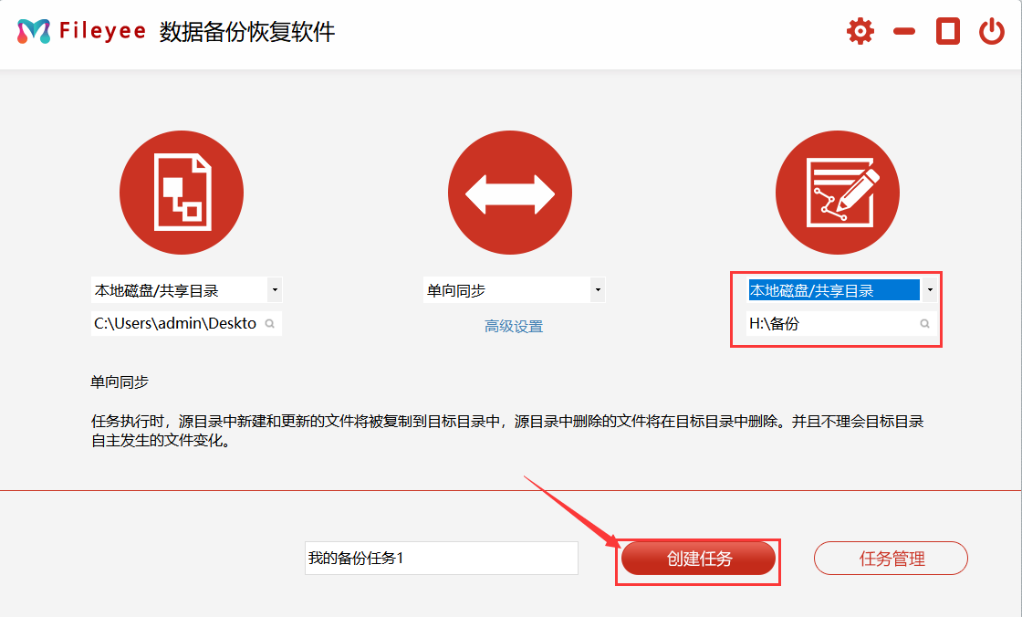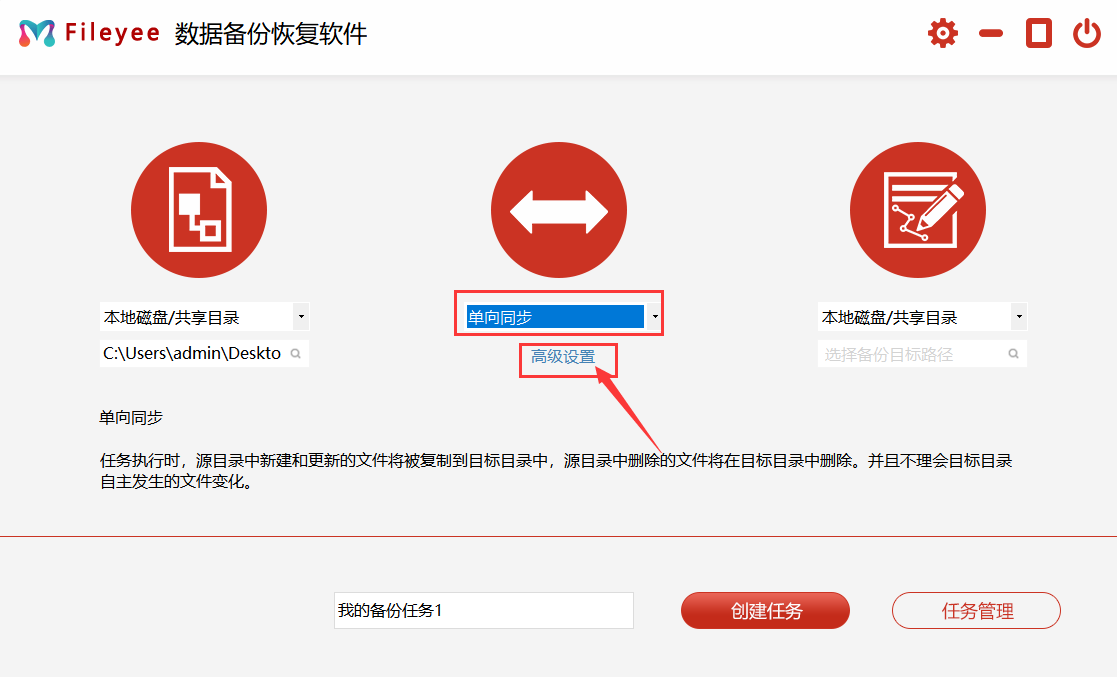 步骤2,随后选择文件同步方式,软件支持的同步方式有:单向同步、双向同步、增量同步、镜像同步、移动同步等,根据需求选择适合你的即可。如果想要实现自动备份,就需要点击下面的高级设置进行相关的参数设置。