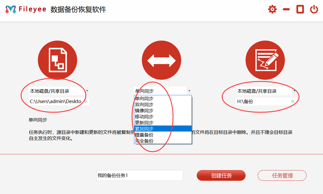 步骤2,如下图所示左边选择需要备份的重要文件所在文件夹,中间是备份数据同步方式的选择,我们选择单项备份,右边是备份目标(也就是文件备份到哪里),我们选择刚刚插入的U盘。