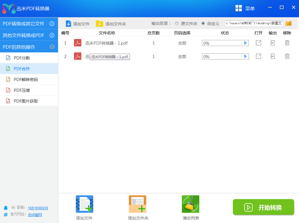 第四步、软件上方有“输出目录”的单选项,什么是输出目录?就是合并后PDF文件的保存位置,你可以选择源文件夹,也可以自定义位置进行保存。然后点击下方的“开始转换”开启合并操作。