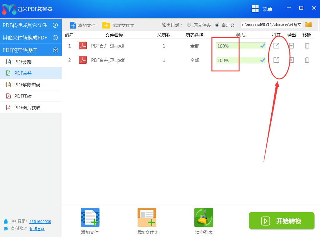 第五步、当每个PDF文件的转换进度状态栏变成100%的时候,说明PDF文件合并成功了,点击右侧打开按钮就可以打开合并后的新PDF文件。