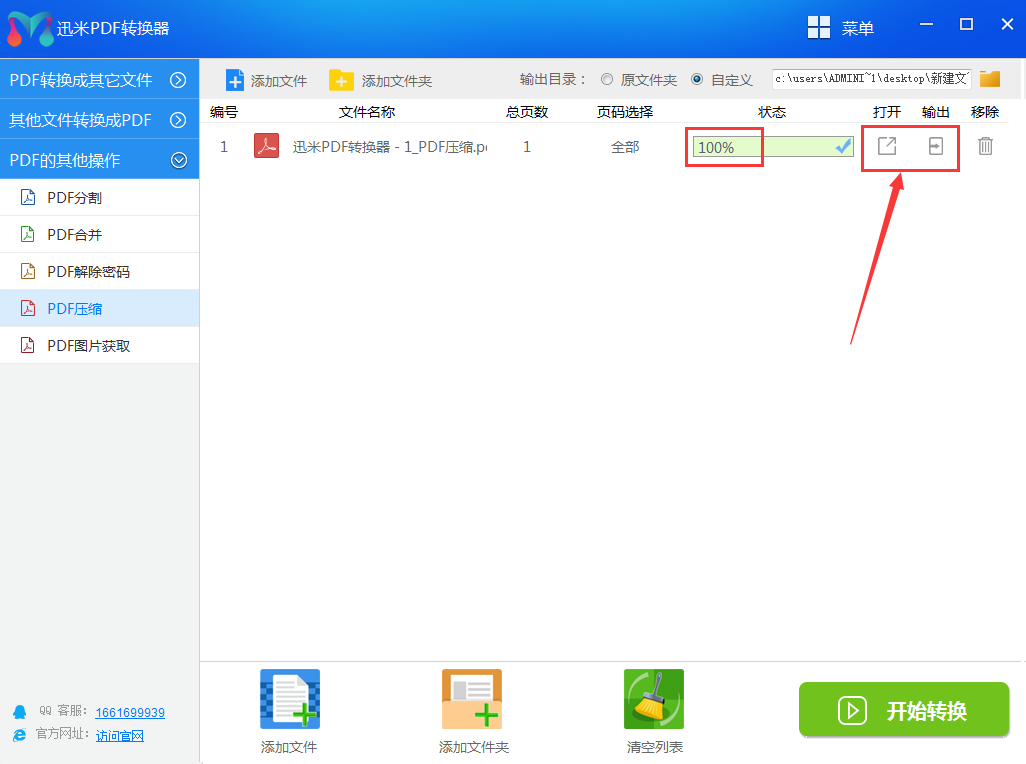 第四步,当转换进度条变成100%的时候,说明软件成功的将PDF文件压缩成功了,点击右侧图标按钮就可以打开压缩后的文件了。