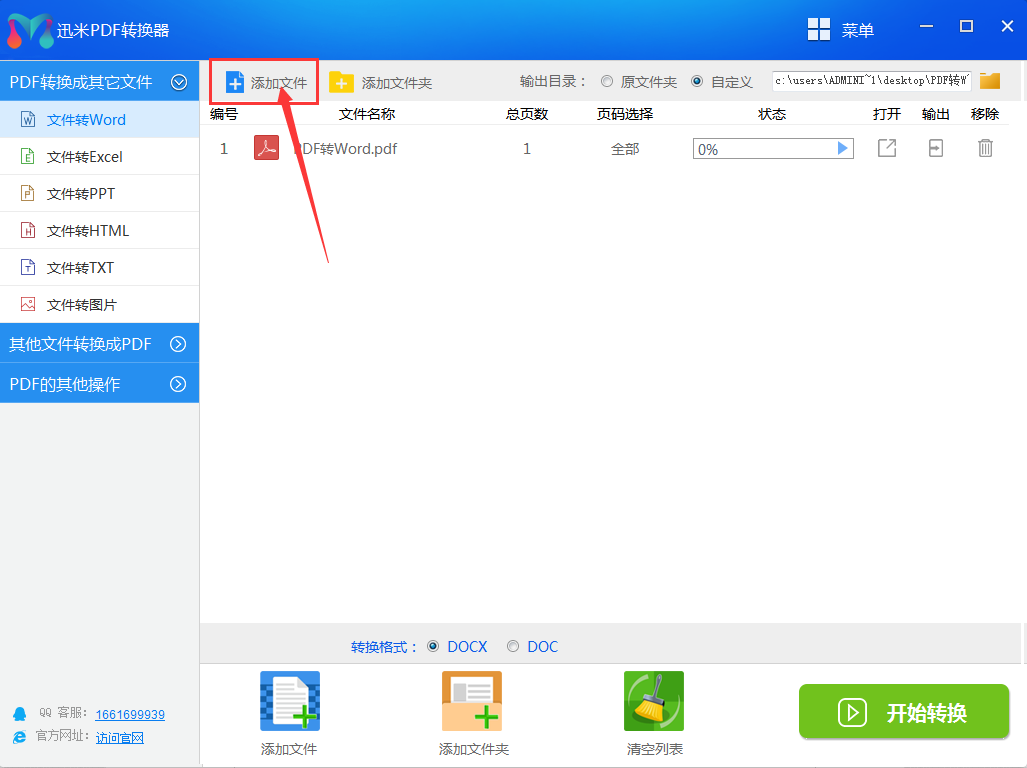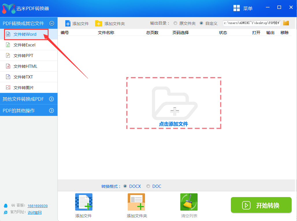 步骤1,打开迅米PDF转换器,在界面左侧的功能列表中找到并点击最上方的【文件转Word】功能,从这里进行接下来的PDF转Word操作。