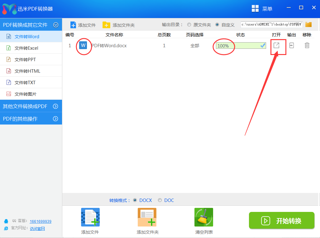 步骤4,当状态栏显示的转换进度条变成为100%的时候,说明PDF整个转换成Word了,PDF图标也变成Word图标,点击右侧的“打开”图标按钮,就可以打开Word文件了。