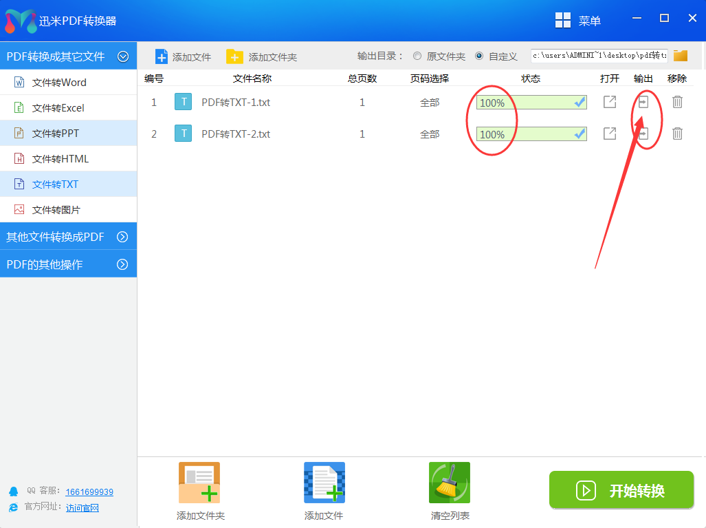 步骤4、当软件右边状态栏下面的转换进度条全部变成100%的时候,说明PDF全部转换成了TXT文件。如果想要打开TXT文件所在文件夹,只需要点击“输出”图标按钮即可。