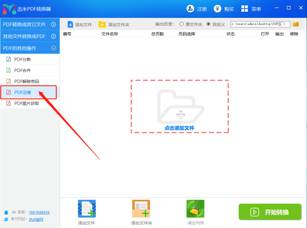 步骤1,打开迅米PDF转换器,在左侧功能区找到并点击功能【PDF的其他操作】-【PDF压缩】,从这里就可以完成PDF压缩变小的操作。