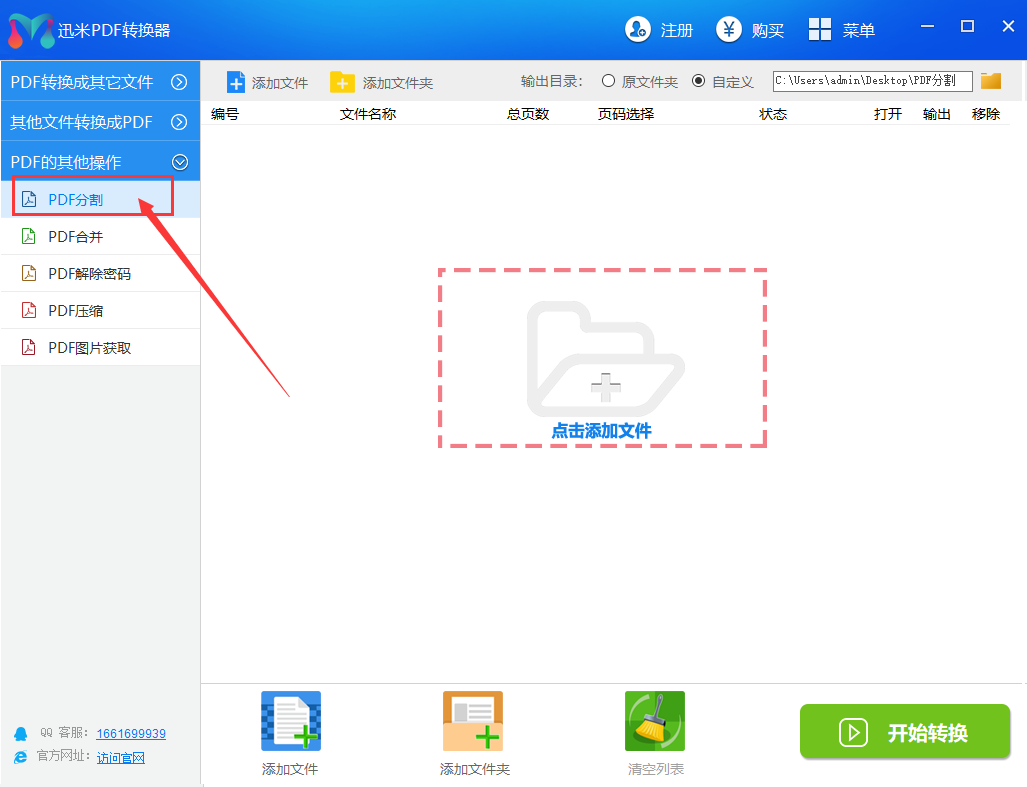 步骤1,打开迅米PDF转换器,在左边的功能列表区分表找到并点击【PDF的其他操作】-【PDF分割】。