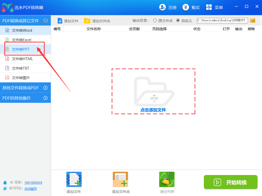 步骤1,打开安装好的迅米PDF转换器,我们要做的是将PDF转换成PPT格式,所以我们需要在软件左侧找到并点击【文件转PPT】功能,进入下一步操作。