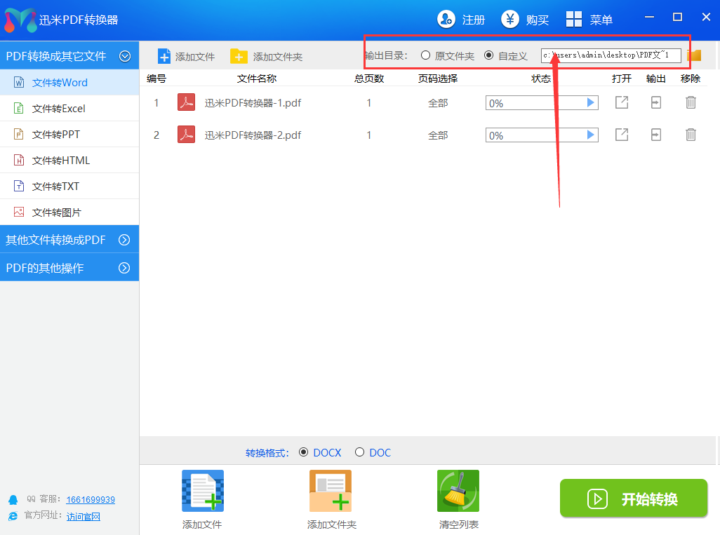 第2步:点击软件中的“添加文件”按钮,将需要转换的PDF文件添加到软件中,然后设置转换格式:doc格式或者docx,二选一。