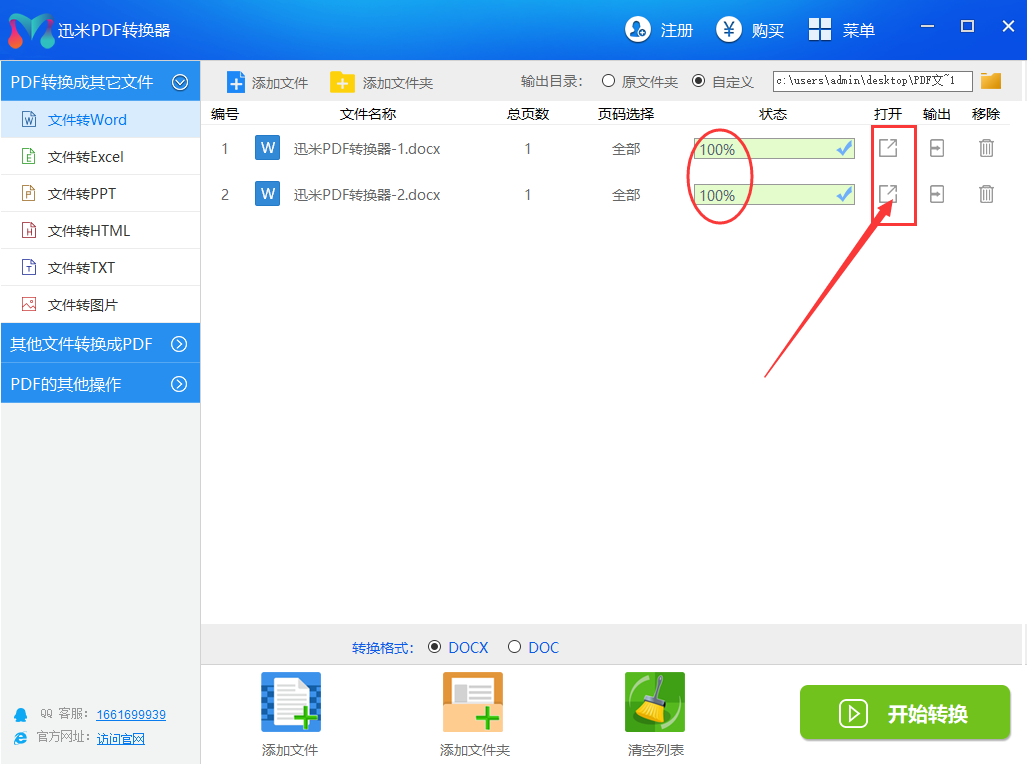 第5步:当软件中状态栏下面的转换进度条到达100%的时候,说明PDF文件成功转换成了word文件。这时候只要点击右边的“打开”图标,就可以打开Word文件了。