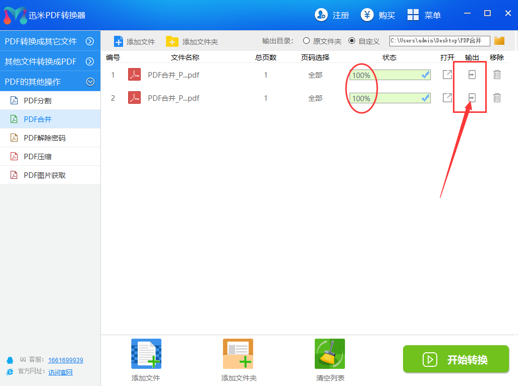 第4,当文件名称后面的合并转换进度条全部变成100%的时候,说明软件中的PDF文件全部合并成了一个PDF文件,点击输出图标按钮,就可以打开其所在的文件夹了。