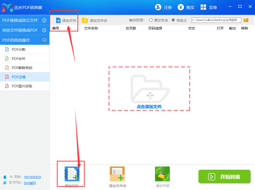 步骤1,安装好迅米PDF转换器后打开,在“PDF的其他操作”功能下找到并点击“PDF压缩”功能,然后进入下一步操作。