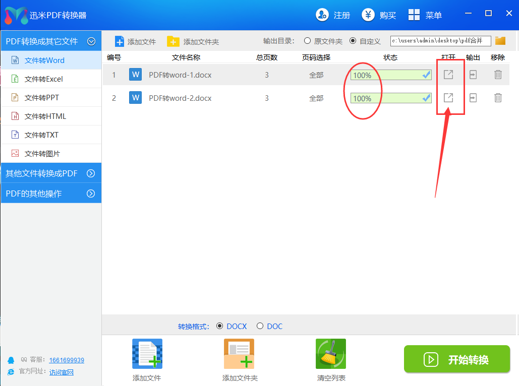 步骤4,当软件中的转换进度条变成100%的时候,说明所有的PDF文件成功的转换成了word文件,如果你想打开哪个word文件,就点开后面对应的打开图标按钮就可以了!