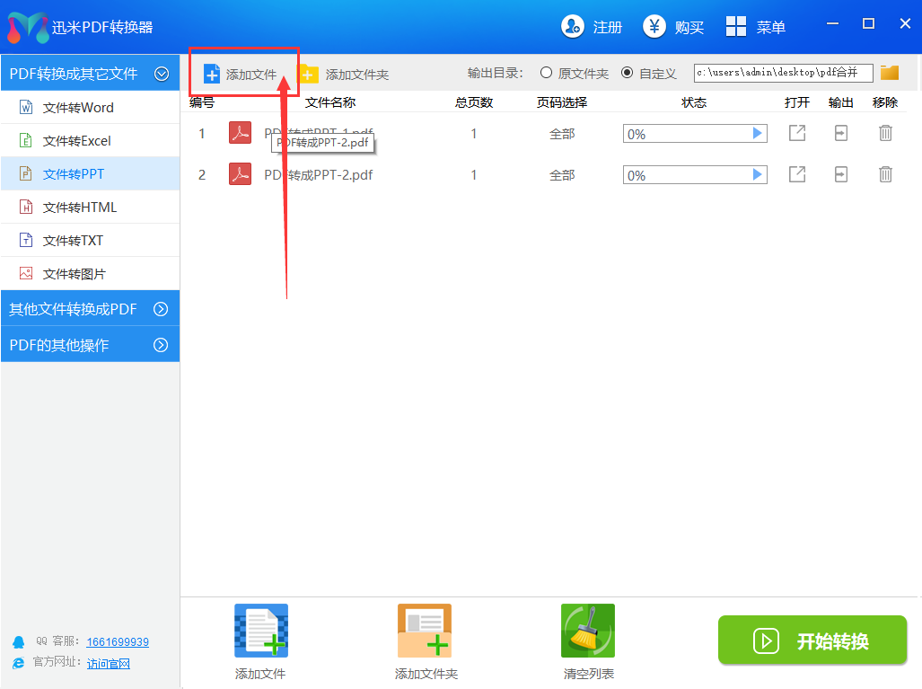 步骤2,如下图所示点击红款中的“添加文件”功能按钮,将所有需要转成PPT的PDF文件全部添加到软件中,添加成功后会显示文件名在软件中。