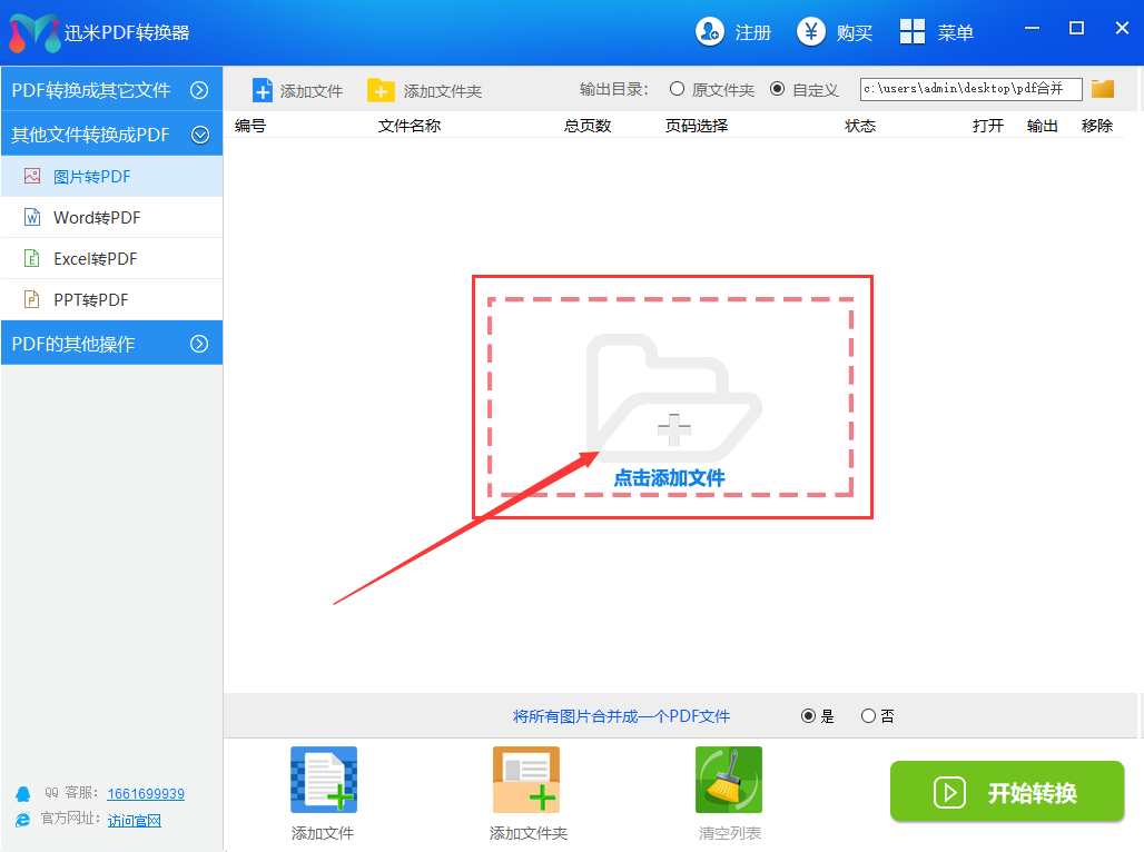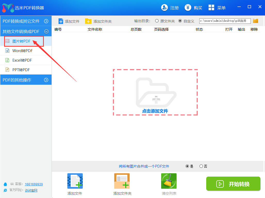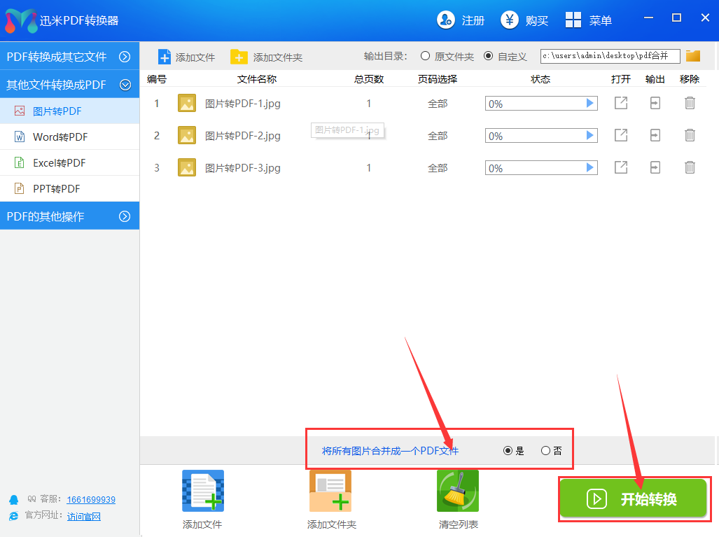 步骤3,设置转换方式,是否将图片合并成一个PDF文件,选择“是”则所有图片都合并到一个PDF文件里,选择“否”则每个图片文件都会转换成一个PDF文件。然后点击“开始转换”按钮,开启转换。
