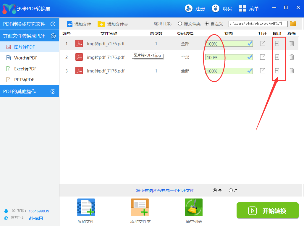 步骤4,当状态栏下面的所有转换进度条都变成100%的时候,说明图片转换pdf成功了,点击右边的“输出”图标,就可以查看转换成的PDF文件了。