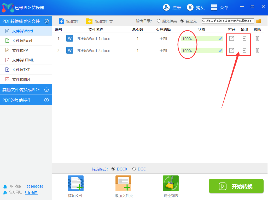 步骤4,当状态栏下面的转换进度条变成100%的时候,说明对应的PDF文件成功过的被转换成Word了,这时点击右边的“打开”或者“输出”图标,就可以查看这个Word文件了。