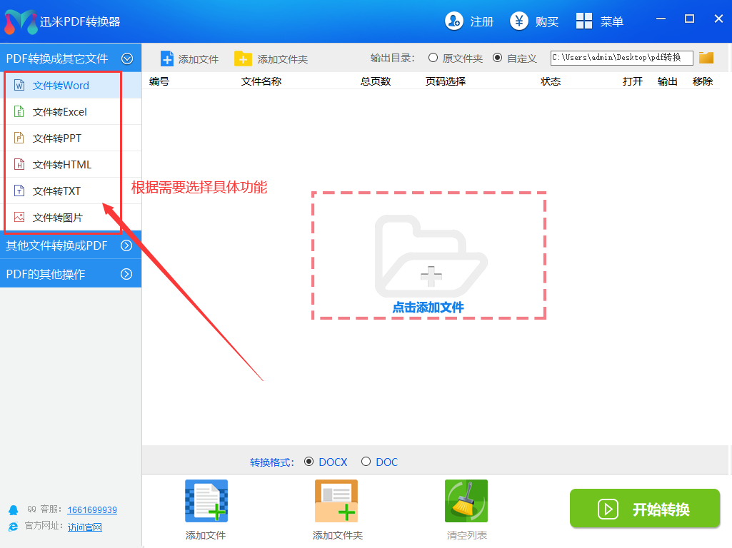 步骤1、打开迅米PDF转换器,软件的左边是功能列表区,我们可以看到“文件转Word、文件转Excel、文件转PPT、文件转Html、文件转TXT、文件转图片”等功能,根据你的需要点击选择对应的功能,进入下一步。(我在这就选择“文件转word”功能来为大家做演示)