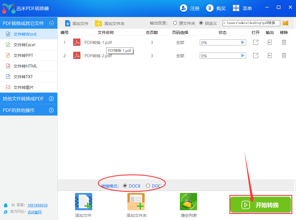 步骤3,选择PDF文件转成word文件的输出格式,doc和docx两种,看你的需求自己选择即可,两种格式没有什么区别。然后点击“开始转换”按钮,开启转换操作,等待十几二十秒钟就可以转换成功。