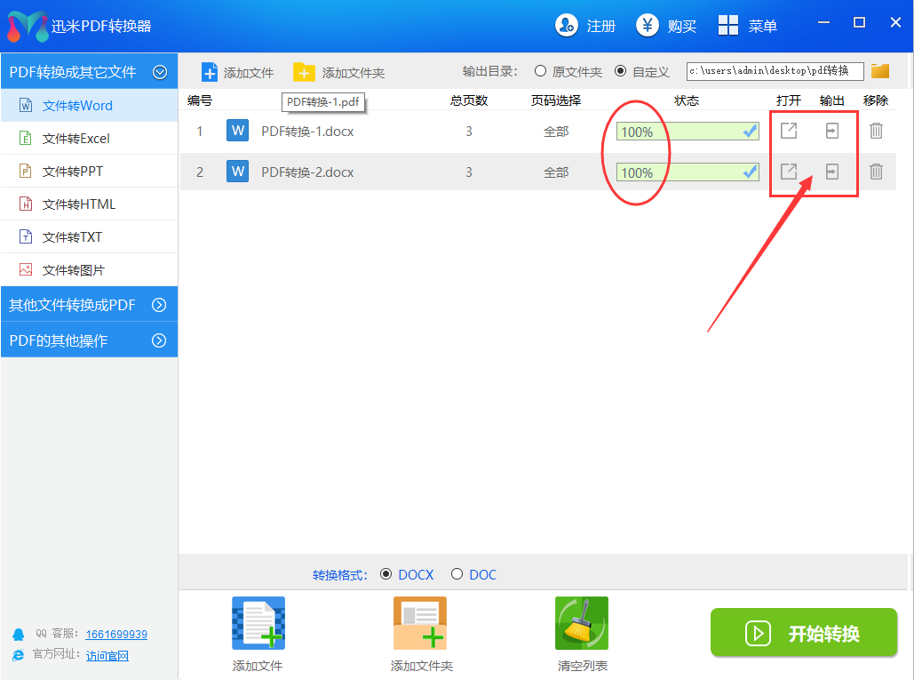 步骤4,当所有文件右边的转换进度条都变成100%的时候,说明这些PDF文件全部转换成了Word文件,如果想查看转换后的word文件,只需要点击右边的两个图标按钮即可。