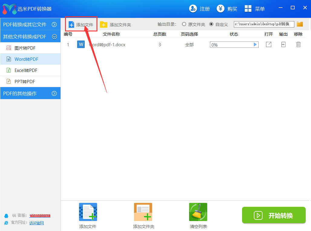 步骤1,在电脑上安装迅米PDF转换器,然后打开软件,在左边的功能列表中依次找到并点击【其他文件转成PDF-Word转PDF】功能。