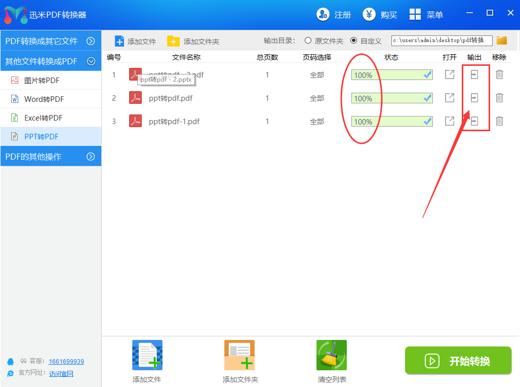 步骤4,当文件名称右边对应的转换进度条变成100%的时候,说明这个PPT文件成功的转换成了pdf文档,点击右边的“输出”图标按钮,就能查看到这个PDF文件了。