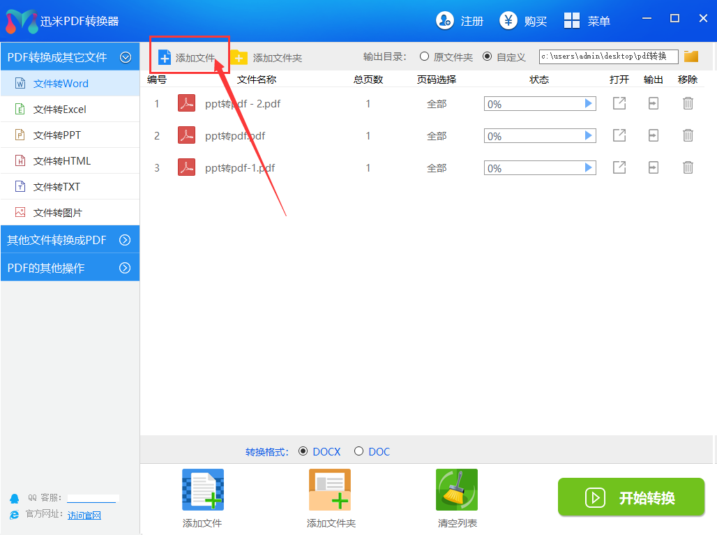 第二步,然后点击软件中的“添加文件”按钮,将需要格式转换的PDF文件全部添加到软件中,软件支持批量转换,更节省时间。